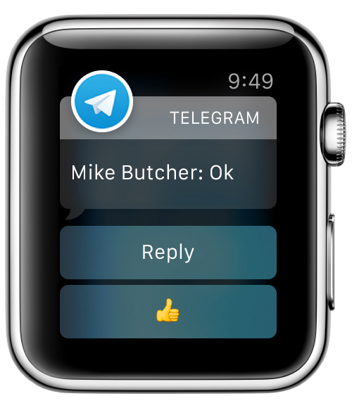 We've made sure that Telegram on Apple Watch does as much as the platform can support right now — and that it does more than any other messaging app out there.
