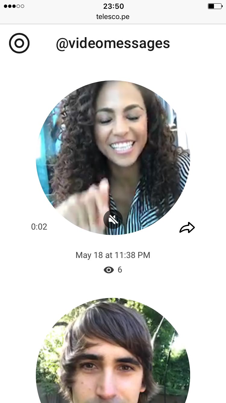 With Telescope, public video messages can go viral beyond the Telegram ecosystem. Telescope hosts autoplayed round videos of up to 1 minute in duration – the same format we use for Telegram video messages. And yes, you heard that right, you don't need a Telegram account to view them.