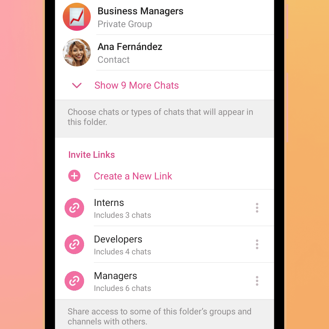 Le cartelle possono avere fino a 100 link d'invito unici, ognuno dei quali dà accesso a diverse chat. Ad esempio, si può creare un link “Manager” che condivide tutte le chat della cartella Lavoro, mentre “Stagista” ne sblocca solo due o tre.